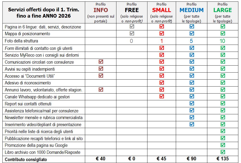 La presenza delle strutture di ospitalità sul nostro portale è la benvenuta e prevede quattro livelli: FREE, INFO, SMALL, MEDIUM, LARGE.