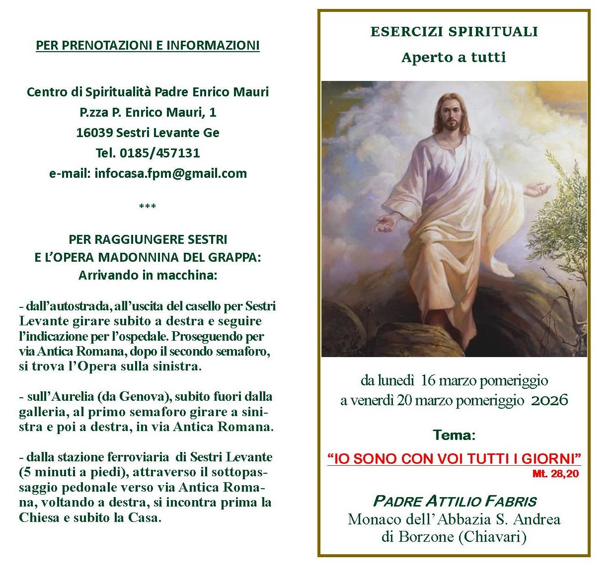 Esercizi spirituali dal 16 al 20 marzo 2026. Leggi i dettagli CLICCANDO QUI.